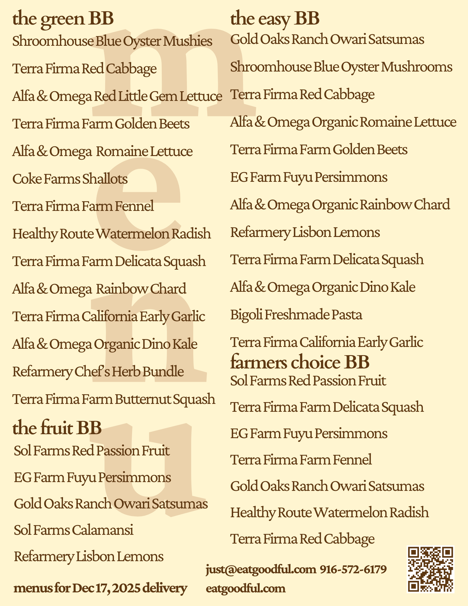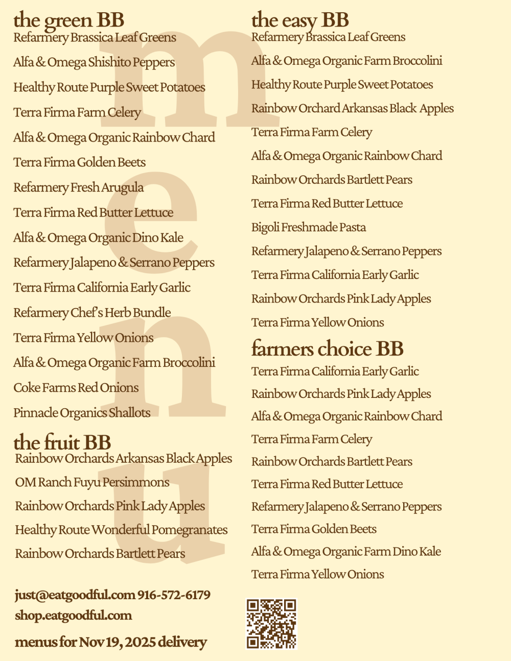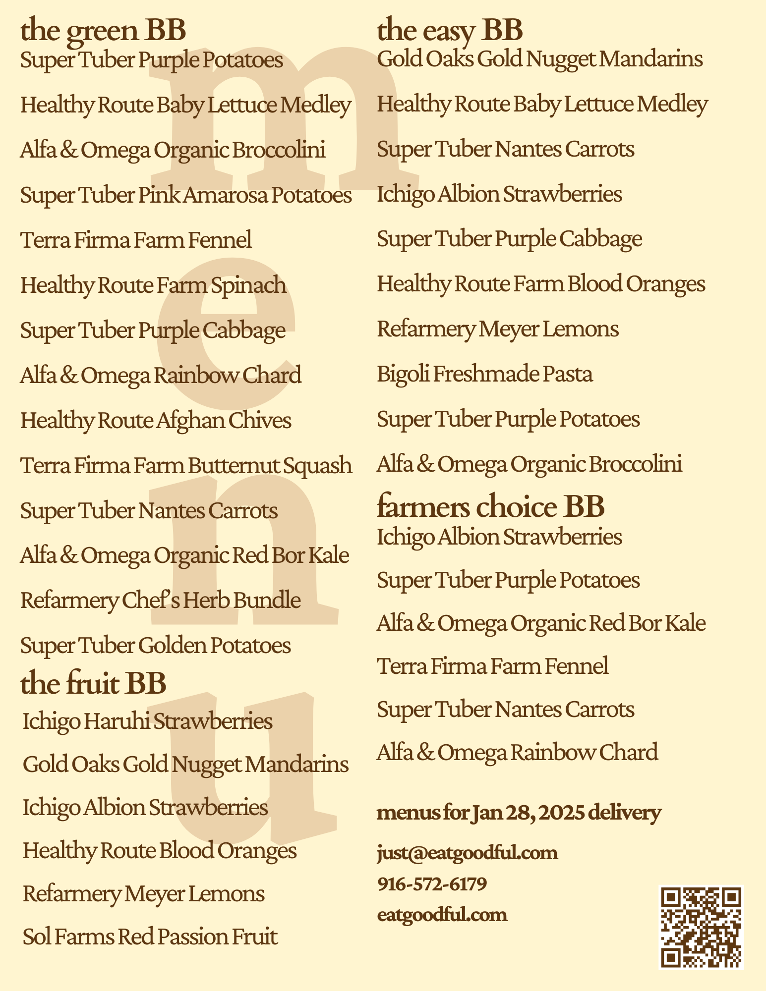 Please see this week’s menu for current Bounty Box contents. This week’s menu is in the images. Select it, then simply click to zoom in. Please note we do our best to get those exact contents, however due to weather, supply chain issues, labor shortages & other small farm/business issues, we may need to substitute some items should they become unavailable. We appreciate your understanding.