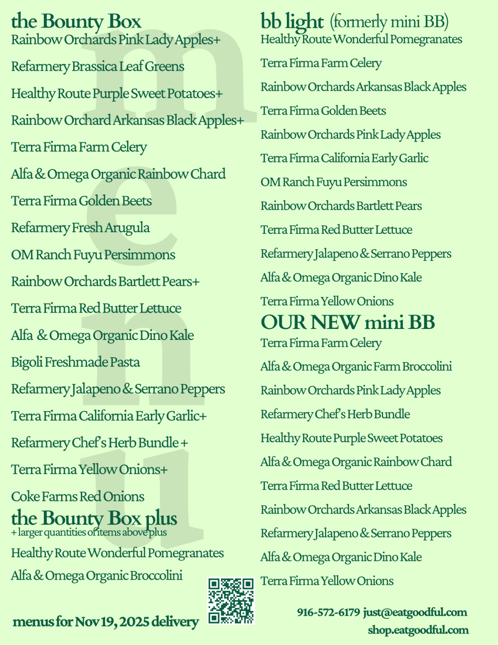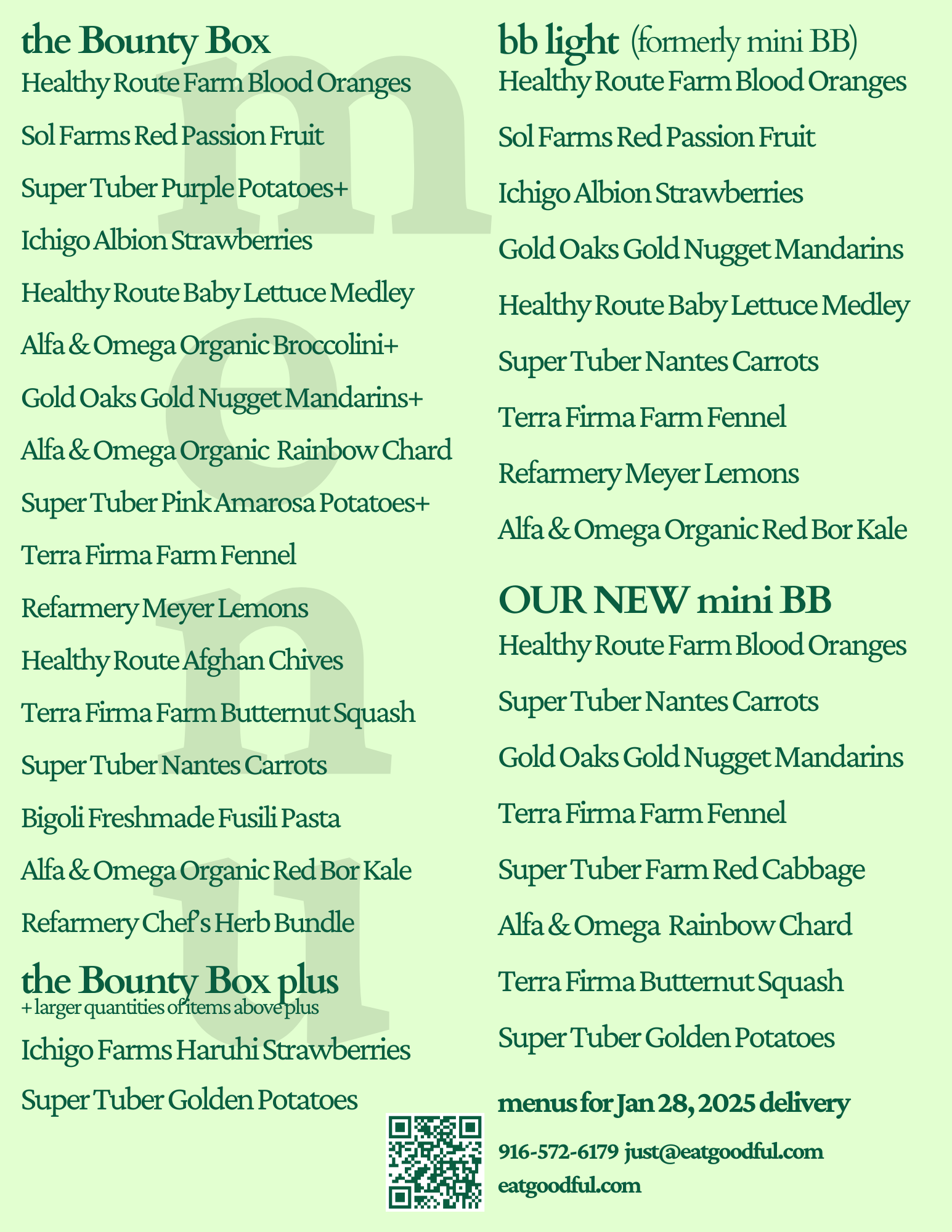 Please see this week’s menu for current Bounty Box contents. This week’s menu is in the images Select it, then just hover over it to zoom in. Please note we do our best to get those exact contents, however due to weather, supply chain issues, labor shortages & other small farm/business issues, we may need to substitute some items should they become unavailable. We appreciate your understanding.