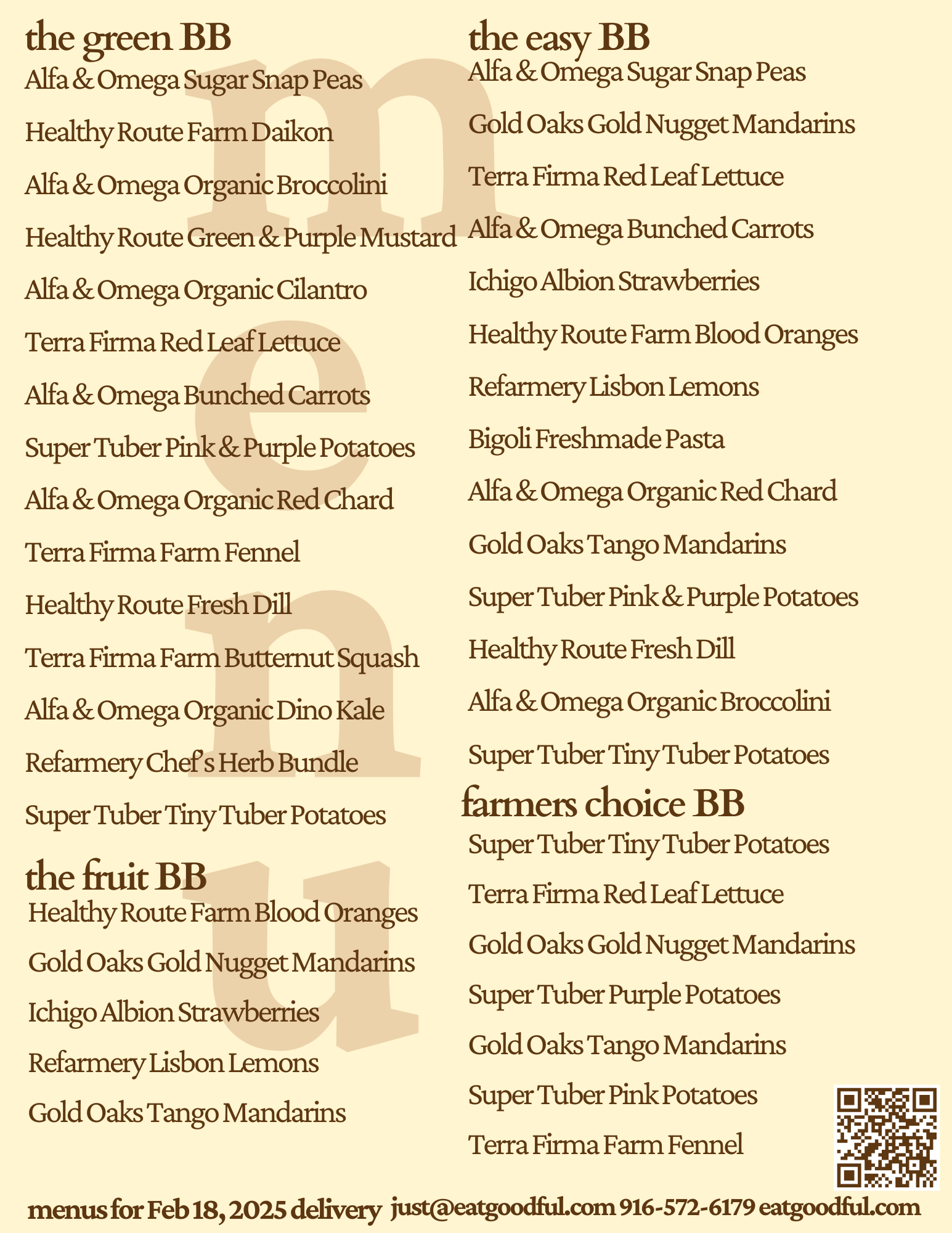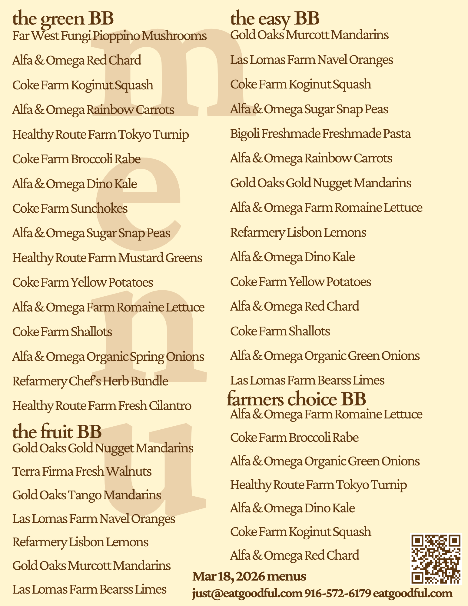 Please see this week’s menu for current Bounty Box contents. This week’s menu is in the images. Select it, then simply click to zoom in. Please note we do our best to get those exact contents, however due to weather, supply chain issues, labor shortages & other small farm/business issues, we may need to substitute some items should they become unavailable. We appreciate your understanding.
