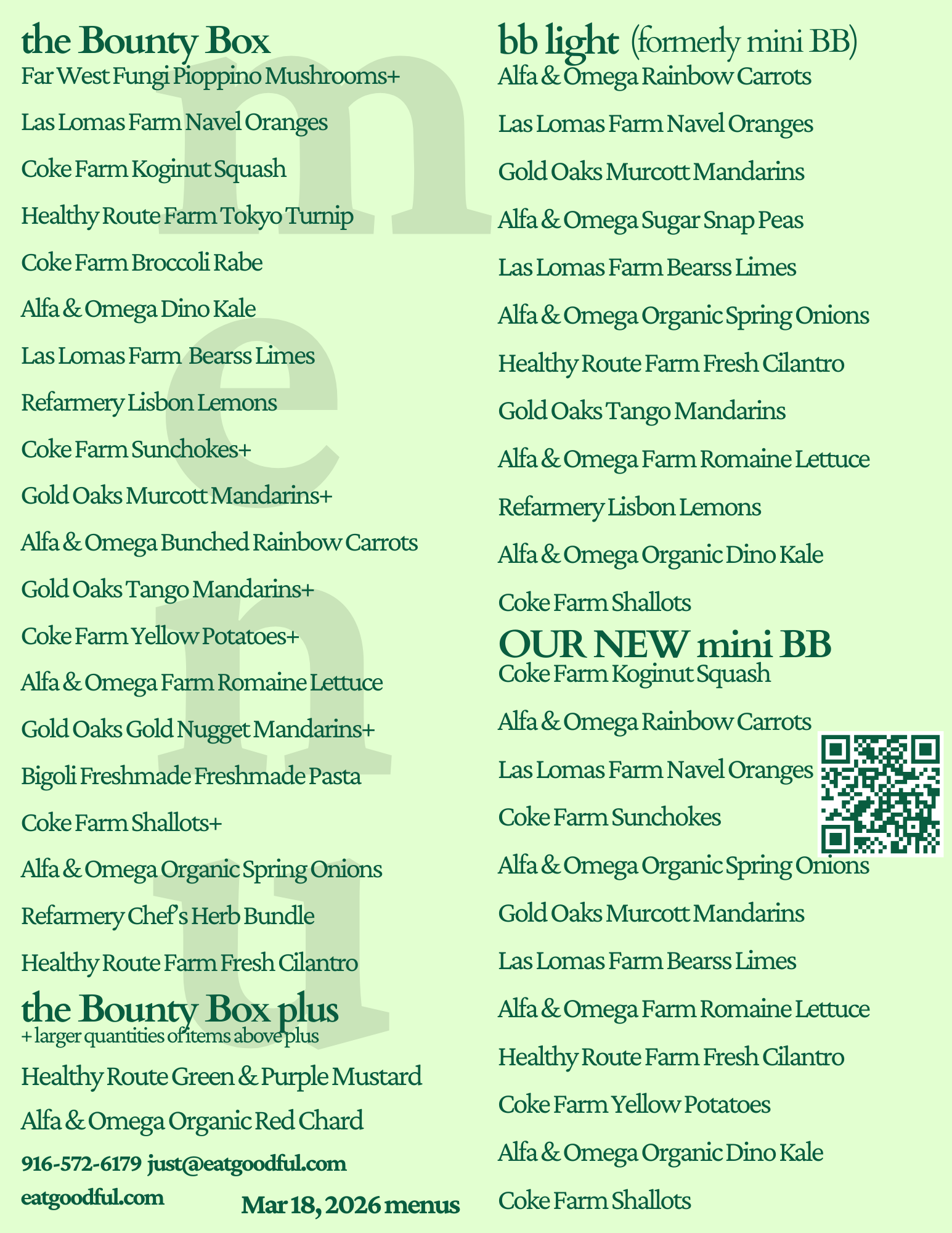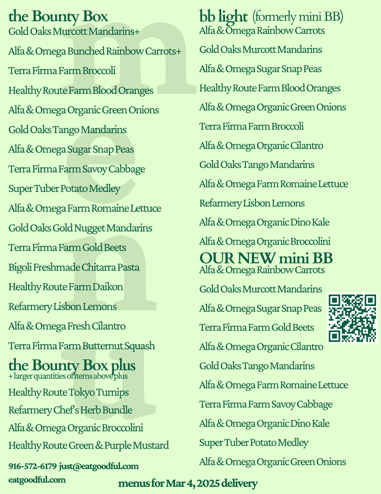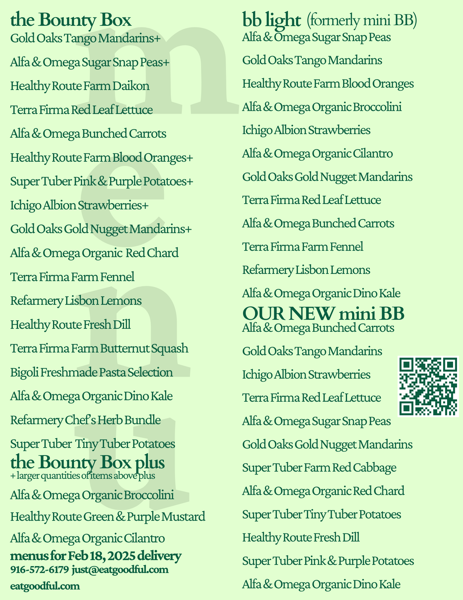 Please see this week’s menu for current Bounty Box contents. This week’s menu is in the images Select it, then just hover over it to zoom in. Please note we do our best to get those exact contents, however due to weather, supply chain issues, labor shortages & other small farm/business issues, we may need to substitute some items should they become unavailable. We appreciate your understanding.