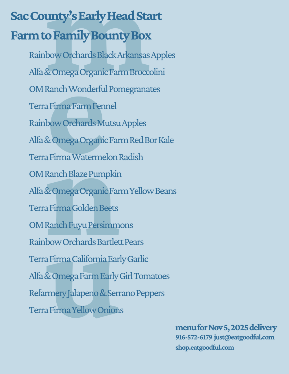 Hello, SCOE Early Head Start families, we're so happy to bring you these monthly deliveries of fresh, local produce! We'll update the menu about 5-7 days before each delivery but please feel free to reach out if we can provide any further info.