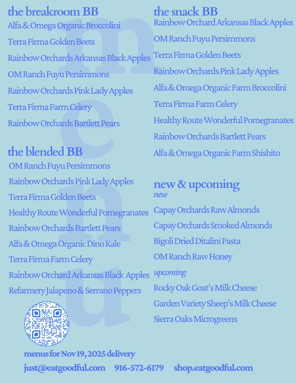 Please see this week’s menu for current Snack Box contents. This week’s menu is in the images. Select it, then simply click to zoom in. Please note we do our best to get those exact contents; however due to weather, supply chain issues, labor shortages & other small farm/business issues, we may need to substitute some items should they become unavailable. We appreciate your understanding.